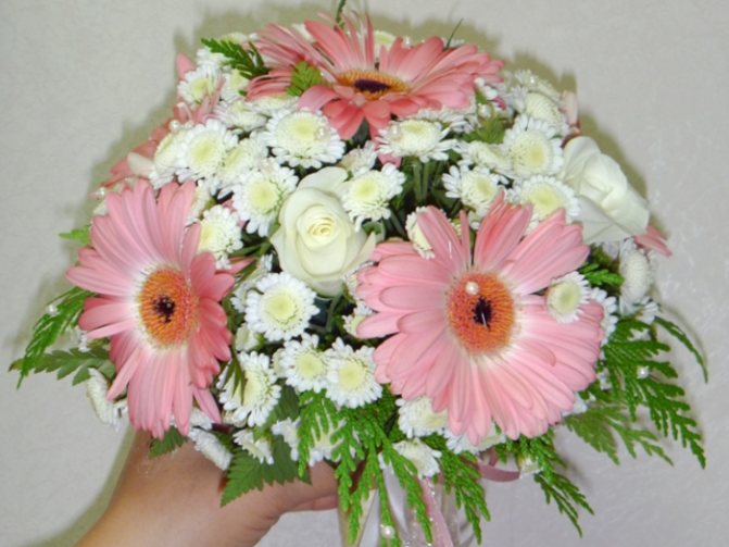 Белые хризантемы и розовые герберы в одном букете Большие красные герберы и пушистые хризантемы в свадебном букете