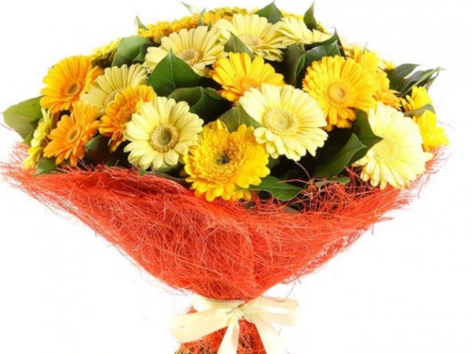 Красиво будут смотреться яркие, теплые, солнечные сочетания цветов. С помощью декоративных элементов, таких как ленты, зелень или специальная трава можно придать букету индивидуальность.