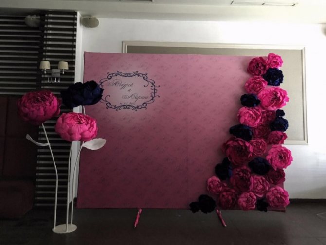 - Бюджетный вариант цветочный стены – это фон из бумажных цветов. Это отличное решение для тех, чья свадьба планируется в зимнее время, когда цветы стоят очень дорого. Это еще и отличное решение для тех, кто остановил свой выбор на бумажном декоре свадьбы. Фон для фотосессии из бумажных цветов вы можете изготовить своими руками. Для этого понадобятся цветная бумага, ножницы, клей и немного свободного времени.