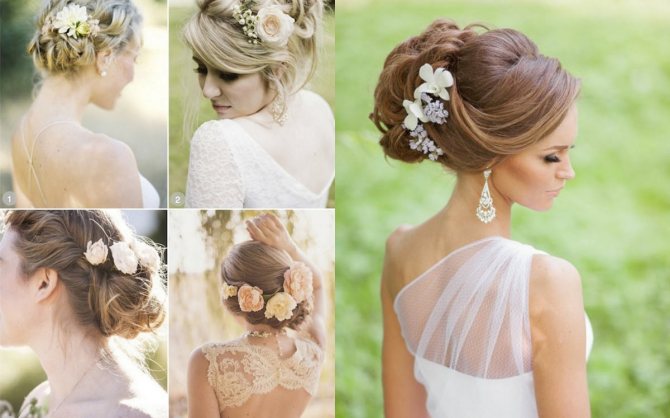 Сегодня в тренде флористическое украшение волос. Великолепно смотрится в свадебной укладке веточка живых цветов. Однако, искусственный образец ничем не хуже настоящего. Существует огромное количество разнообразных вариантов данной укладки. Важно, чтобы колер соцветия гармонировал по цветовой палитре с нарядом.