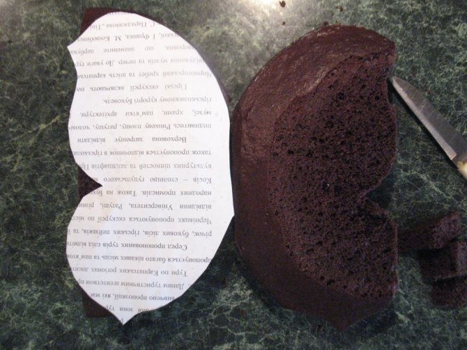 Дальше разрезаем торт пополам и приступаем к вырезанию формы бабочки. Чтоб крылья получились желаемой формы, нужно предварительно нарисовать их на бумаге. Для этого под половинку коржа подкладываем лист бумаги, обрисовываем ее по контуру, а затем вписываем в полученный полукруг крылья. Затем вырезаем нарисованные на бумаге крылья и кладем полученное клише на половинку коржа. По полученному трафарету аккуратно вырезаем нужную форму торта.