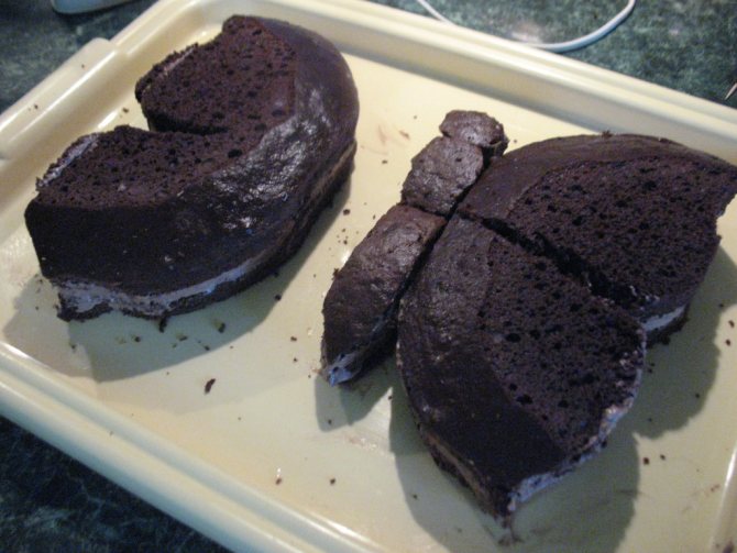 Но я буду рисовать реальную бабочку) Для коржей я взяла рецепт Пражского торта https://kashalot.com/club/post-31188/ Спасибо большое Ане, получилось супер! Для удобства приведу рецептуру здесь. Для теста: 1 банка сгущенки сырой 2 яйца 1 стакан муки 3 ст.л. какао 1 ч.л. соды, гашеной лимонным соком Для крема: 200 г сливочного масла 0,5 банки сгущенки сырой 2 ч.л. какао 1 ст.л. спиртного (лучше ликера, либо коньяк) Рецепт для глазури из оригинального рецепта также приведу, хоть он мной не использовался: 0,5 стакана сахара 5 ч.л. молока 3 ч.л. какао 50 г сливочного масла Приготовление Тесто: Все ингредиенты перемешать, разделить на 2 части и выпечь 2 коржа. Каждый разрезать на 2 части после остывания. Пропитать спиртным или вишневым вареньем. Крем: Размягченное масло и остальные ингредиенты взбить миксером до однородной массы. Глазурь: Все ингредиенты сварить, немного остудить до начала загустевания. Украсить торт шоколадной глазурью и оставить пропитаться где-то часик без холодильника. Торт испекся с горбиком посредине, как по заказу. Мне этот горбик очень пригодился. А пока срезаем горбик и откладываем его в сторону.