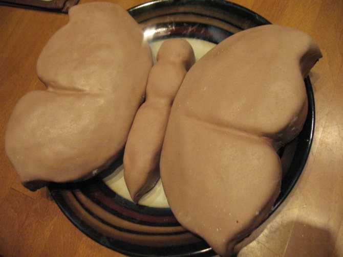 Я решила делать торт с двух независимых половинок, для каждой девушки индивидуальный кусок – крылышки, а всем остальным – туловище, она тоже из отдельно лежащего фрагмента. Для туловища как раз пригодился срезанный из торта горбик. Перемазала кремом (состав крема в ссылке с рецептом торта выше) туловище изготовила со срезанного горбика)))