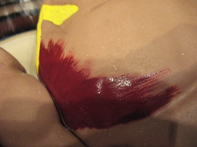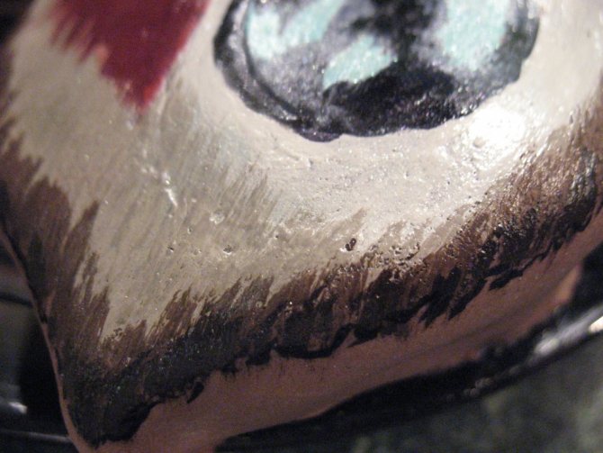 Затем заполняем нужные зоны красным. Делать это нужно быстро, так как краситель подсыхает и превращается в желеобразную массу и его растянуть по поверхности уже не получится. Места, где должны быть плавные переходы одного цвета в другой, а также контуры, лучше делать как бы «рваными», затем заполняя зону перехода мелкими мазками другого цвета. Плавно растянуть один цвет в другой, как при рисовании акварелью, здесь не получится. Поверхность красителя быстро переходит в гель. Ложится краситель ровно и гладко, если закрашивание поверхности проводить мазками в одном направление. Застывший слой лучше не подправлять, а то можно сделать еще хуже)
