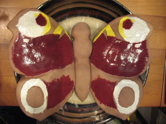 - Из мастики или марципана. Это две похожие друг на друга кондитерские эластичные пасты, только мастика слаще, а марципан имеет специфический привкус ядер миндаля. Из эластичной массы вылепливается тельце бабочки, а крылья вырезаются из раскатанного пласта. Затем все части собираются вместе и закрепляются на торте. Можно сделать и плоские изображения из раскатанной тонким слоем пасты. Есть и специальные трафареты для вырезания бабочек одинаковой формы.