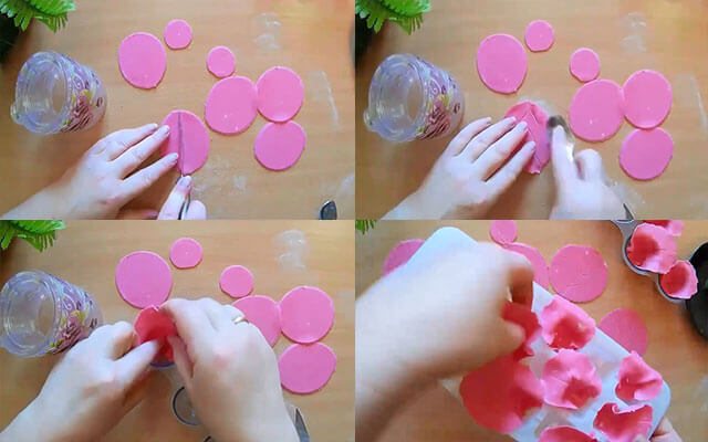 6Кладем перед собой губку, сверху на нее один кружочек. Берем в руки моделирующую палочку с шарообразным наконечником. Условно разделяем кружок на три горизонтальных части, две из которых раскатываем палочкой, чтоб получилась немного волнистая поверхность – это наши лепестки.