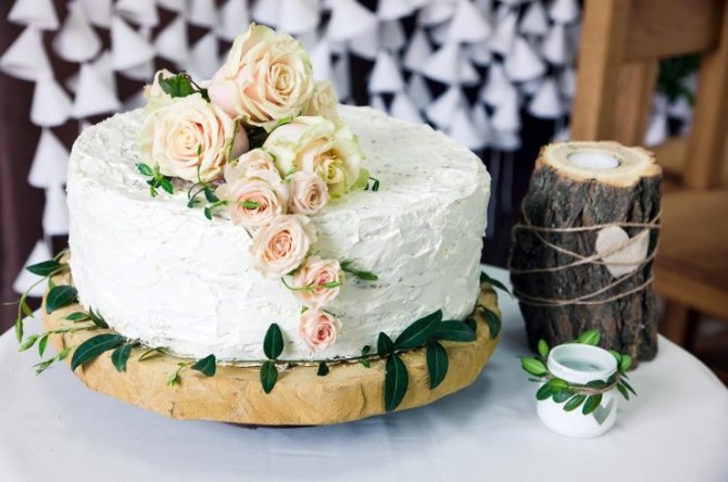 - На белом или молочном изделии прекрасно могут смотреться белые розы с бутонами и декоративной зеленью. Особенно выгодно смотрятся рельефные фактуры многоярусных тортов. Очень часто на классические варианты специалисты устанавливают веточки орхидей.