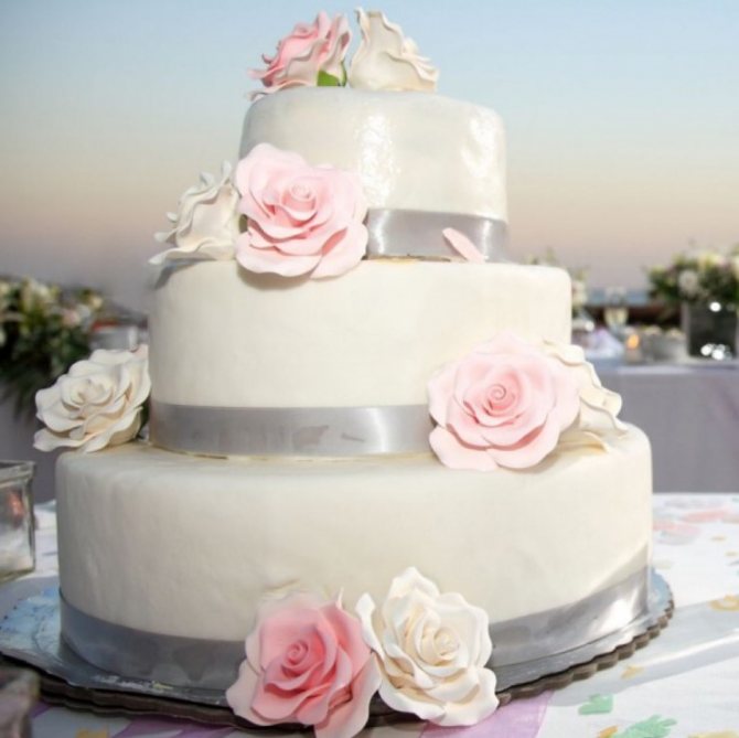 - Белый торт можно дополнить роскошными красными розами. Особенно выигрышно смотрятся алые пионовидные розы, расположенные на трёхъярусном свадебном кондитерском изделии. Сама конструкция торта может быть и гладкой, и дополненной различными кремовыми узорами.