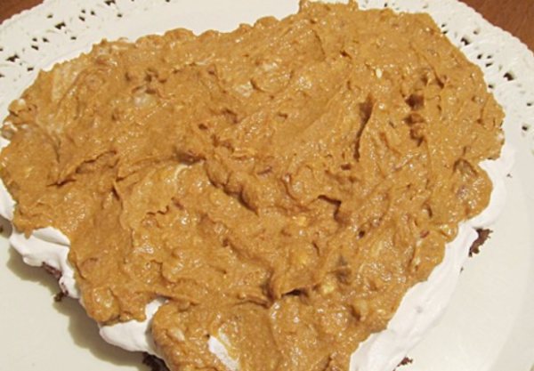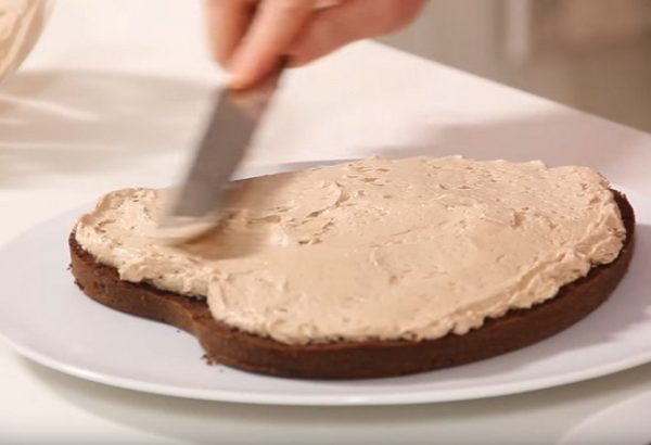 - Приступаем к сборке торта. Нижний корж промазываем сливочным кремом, наносим пасту с орехами.
