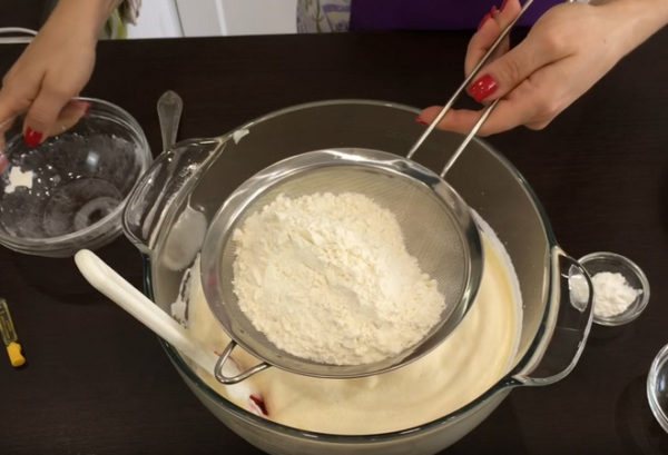 - Просеянную муку делим на 2 части, вводим ее в общую смесь. Вымешиваем тесто лопаткой, делая движения снизу вверх.