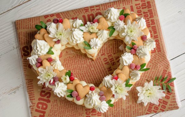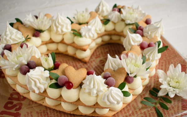 В домашних условиях кондитерское искусство позволяет использовать простые варианты оформления кремом, шоколадом или фруктами – главная идея будет сохранена в контуре сердца, который останется в памяти и на фотографиях.