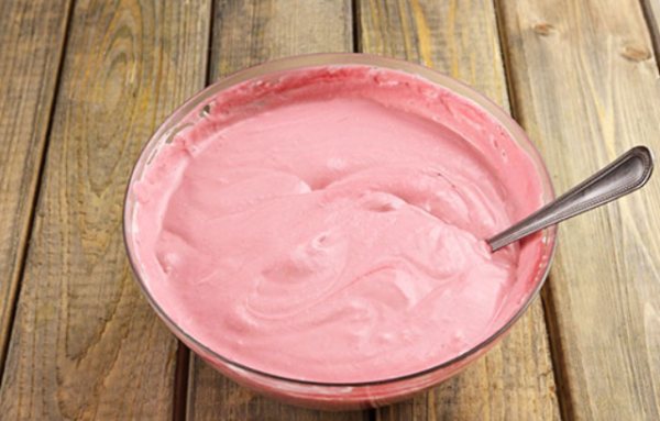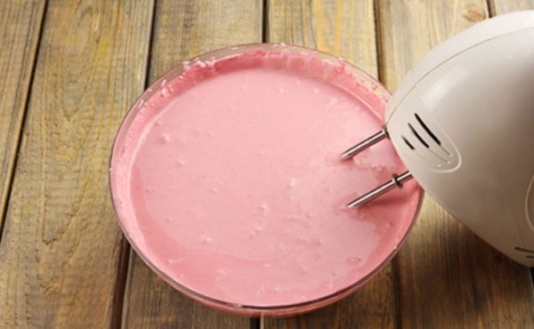 - Охлажденные сливки заливаем в глубокую миску, взбиваем миксером до густоты. Выливаем ягодный сок к сливкам, хорошо вымешиваем. В тарелку отправляем желатин, заливаем его кипяченой водой. Ждем, когда желатин набухнет.