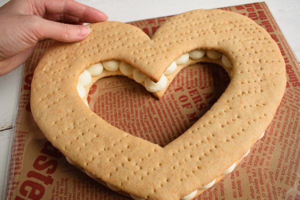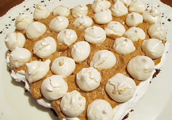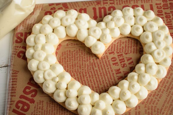 - Выкладываем безе в виде сердца, промазываем кремом. На этот раз наносим кремовые составы в обратном порядке.