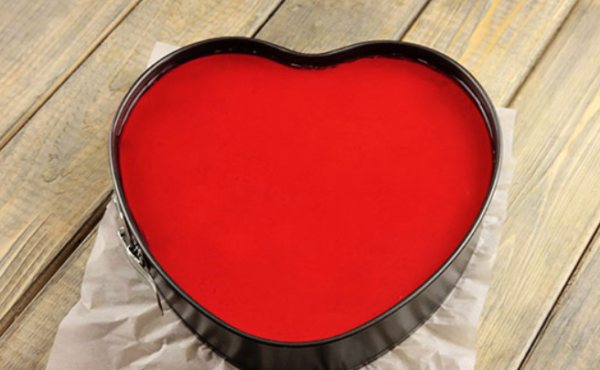 - Готовим форму для выпечки, она должна быть в виде сердца. Дно застилаем пергаментом, выливаем тесто.