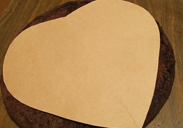 - Берем плотный картон, вырезаем из него сердце. Прикладываем шаблон к бисквиту, переносим фигуру на корж. Срезаем лишнее, получаем 2 коржа в виде сердца.