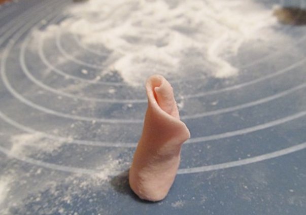 Если вы работаете в сухом помещении, то вам может понадобиться размягчить вашу мастику, чтобы предотвратить образование трещин на поверхности. Для этого достаточно вмешать в тесто небольшое количество воды и погреть его в руках. Старайтесь все делать быстро, чтобы мастика не успела высохнуть и начать растрескиваться. В условиях повышенной влажности вам может потребоваться вмешать в мастику дополнительное количество сахарной пудры и увеличить время между этапами, чтобы части фигурки не смешивались.