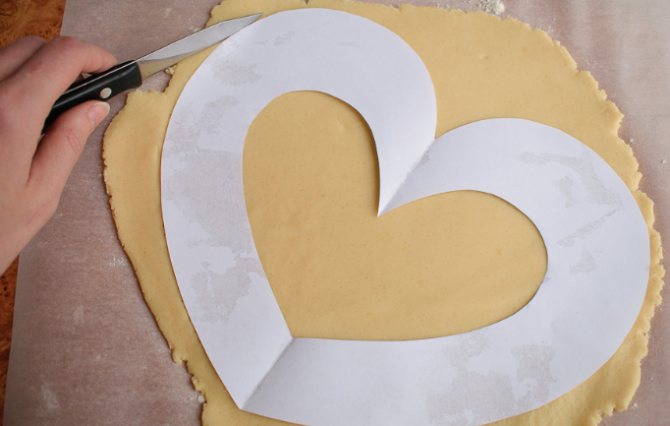 - Подготовим бумажный шаблон в виде сердца, потребуется 2 заготовки. Выкладываем на них тесто.