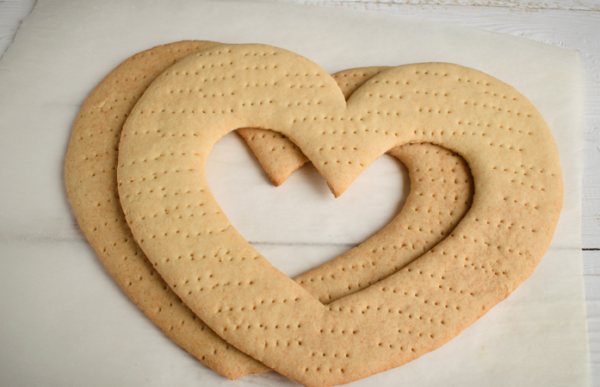 Предполагает выпечку круглых коржей, из которых затем по трафарету вырезается аккуратное сердце. Сборку можно осуществлять без формы.