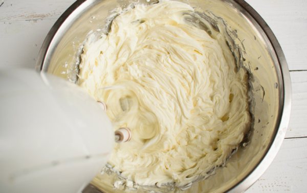 - Займемся приготовлением крема. В одной миске соединяем сыр со сгущенкой. Взбиваем массу миксером до однородности. Крем получается пышным, светлого оттенка.