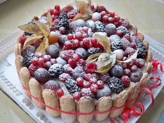 - Верхнюю часть торта украсьте кремом и ягодами. Чтобы крем выглядел красиво, наполните им кондитерский шприц и воспользуйтесь специальными насадками.