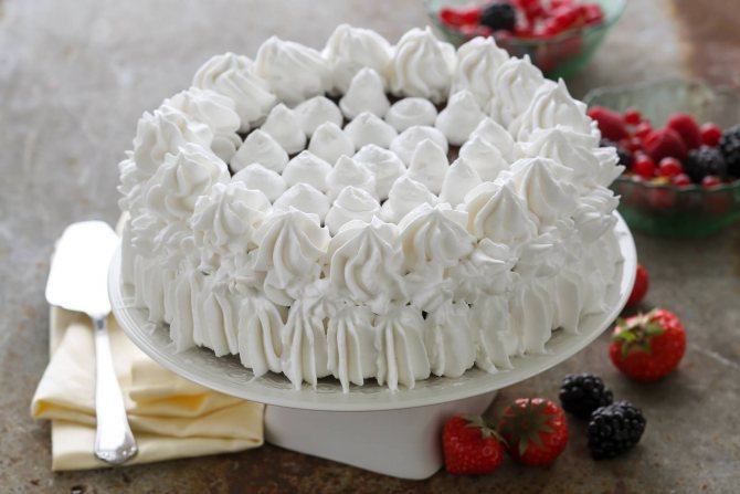 - Верхушку торта украшаем смородиной, безе и кремом. Крем должен покрывать в данном случае всю поверхность торта, поэтому для красоты десерта используйте кондитерский шприц с насадкой «Роза».