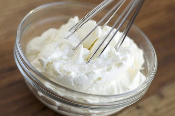 - Приготовьте крем: взбейте 0,4 л жирных сливок, чтобы они превратились в пену. Отдельно взбейте 0,2 кг сметаны, перемешанной с 0, 2 кг сахарной пудры. После этого сливки со взбитой сметаной нужно соединить и перемешать лопаткой, чтобы получился единый крем.