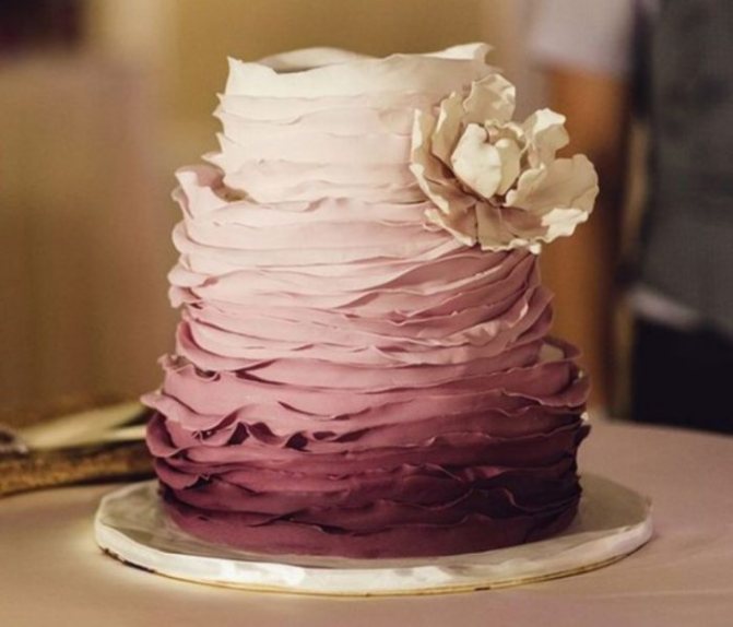 Чтобы сделать переход цвета на десерте, необходимо вырезать два прямоугольника. Выкладывают более темный цвет внизу, а более светлый наверх со смещением в половину. Далее с помощью скалки они раскатываются до тонкого слоя. Затем вырезается круг, который впоследствии покрывают на торт. Можно также использовать его и не на всей поверхности, а лишь на половине, создавая волны. Этот вариант смотрится необычно и загадочно.