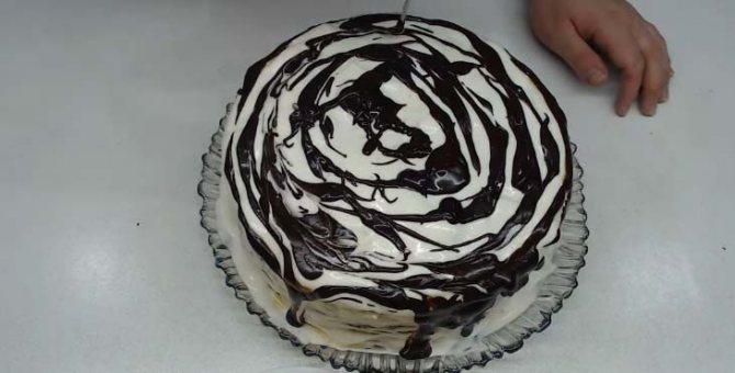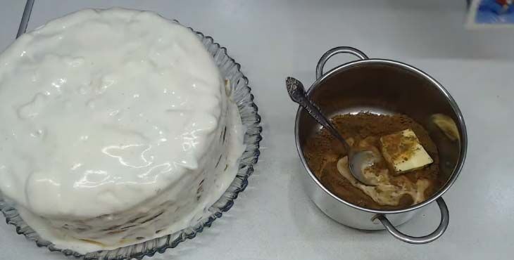 7. Растопить на огне до жидкого состояния, размешать. Сверху торт полить готовой глазурью.