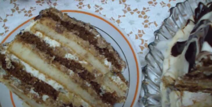 - Выпечь бисквит из яиц, желтков, 2 стаканов сахара, муки, масла и ванилина.