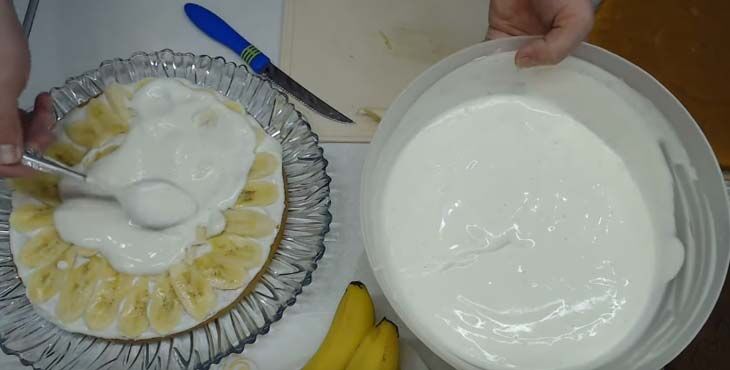 3. Смазать корж сметанным кремом. Выложить бананы, сверху также промазать кремом.