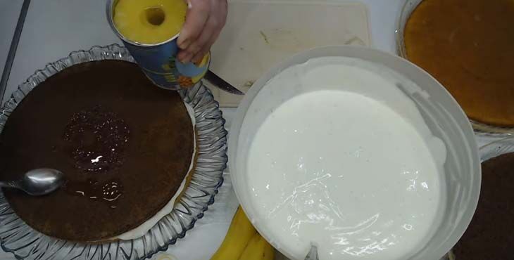 5. Смазать кремом и выложить ананасы, сверху еще один слой крема и так далее. Последний корж также должен быть покрыт кремом.