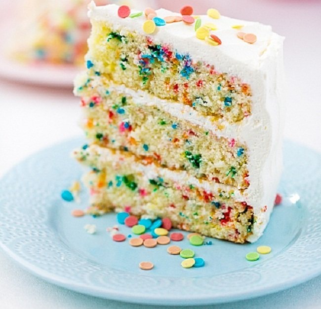 Идея этого торта завоевывает сердца все новых и новых сладкоежек. Вы просто добавляете крашеный сахарный топинг в свой любимый торт, затем прослаиваете и оформляете своим любимым кремом, украшаете сахарной конфетти и торт готов! :-). Работа не большая, а эффект может быть даже более впечатляющим, чем в торте Радуга. Я рекомендую это для детской вечеринки или новогодних праздников.