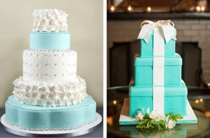 Наиболее популярен для торжества в синем цвете вариант многоярусного торта. Мастера кондитерского искусства устанавливают ярусы друг на друга, также может применяться вариант, когда каждый ярус лежит на отдельном блюде, закреплённом на специальных подставках.