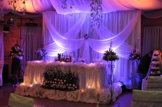 - Стол также нельзя обделять цветами. При оформлении в основном будет задействована его передняя часть, обращенная к гостям. Цветки можно расположить на складках скатерти в виде своеобразной арки, чередуя их по оттенкам. Красиво смотрятся небольшие гирлянды цветов, свисающие, словно выбивающиеся из общей арочной композиции.