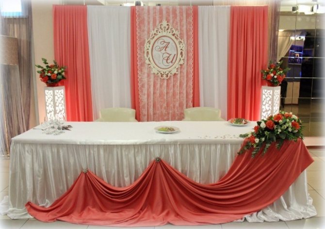 - Так, сочетание белой и красной материи придаст зоне молодых больше роскоши. Стол покрывают белой длинной скатертью, которая спускается до самого низа ровными симметричными складками. Нижнюю часть ткани красиво выкладывают на полу. Контрастную по цвету ткань набрасывают на верхнюю часть стола с одной стороны и драпируют книзу под небольшим углом, закрепляя её на складках скатерти на разных уровнях. Нижние концы ткани в живописном беспорядке располагают на краях скатерти, лежащих на полу.
