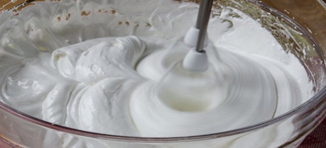 Для начала взбейте 150 г яичных белков с 300 г сахара. У вас должна получиться очень плотная пена.