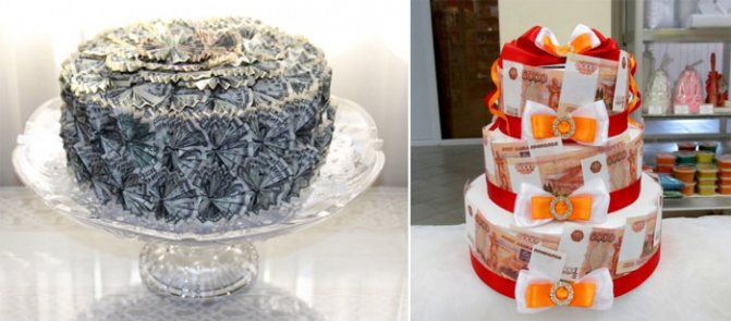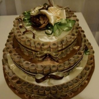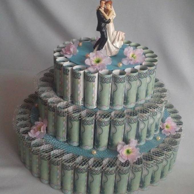 - Денежный торт поможет молодоженам поднять настроение, он их развеселит. Кроме того, такую сладость можно сделать из ненастоящих денег. Таким образом, подарок останется на долгую память.