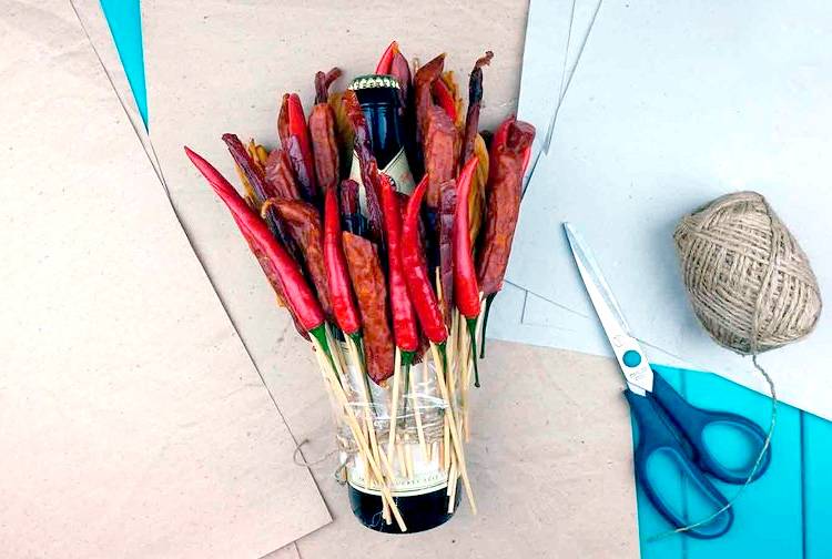 Мы вам предлагаем взять охотничьи колбаски (можно взять салями) и вяленую горбушу. А чтобы разнообразить презент и внести в него необычную нотку, нужно добавить копчёный сыр (косичка) и красный острый свежий перчик. А колбасного букета будет бутылка пива, можно взять виски Jack Daniels или вино. Последнее будет особенно вкусно, ведь вино и сыр — идеальный дуэт.