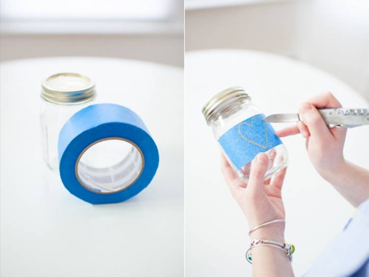 Для подсвечника лучше выбрать небольшую баночку интересной формы. На ее середину наклейте широкую полоску малярного скотча. Нарисуйте на нем сердце желаемой формы и размера.
