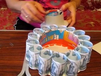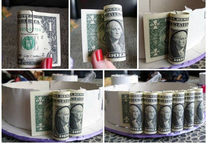 И если вы были внимательными, то уже знаете, что для того чтобы сделать этот оригинальный презент вначале надо смастерить для него картонный каркас, и только потом прикреплять к нему купюры.
