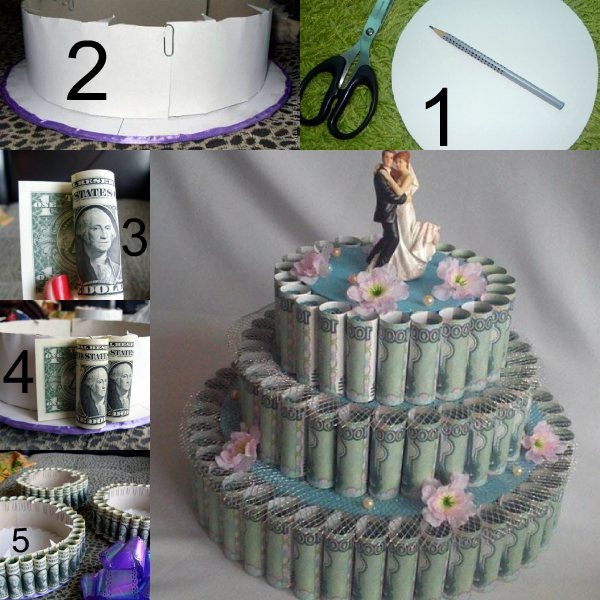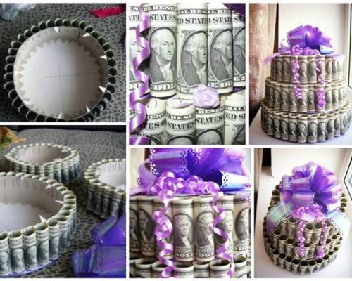 Правда для свадьбы такой эксцентричный вариант не подойдет. А поскольку основным атрибутом этого праздника считается торт, лучше всего сделать его аналог, только из денег.