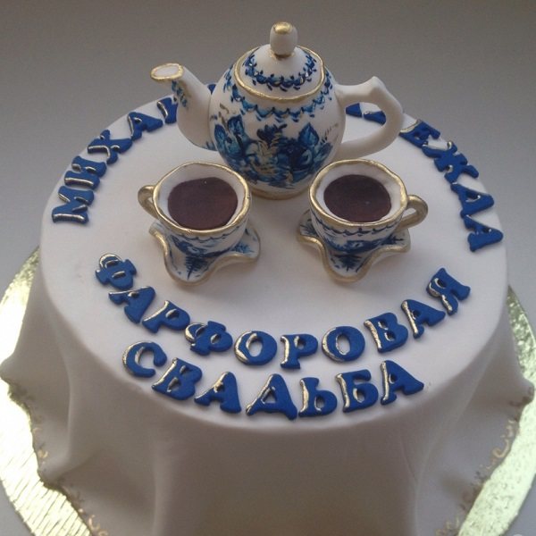 Чтобы точно удивить своих гостей, закажите на свою фарфоровую свадьбу сладкое лакомство, как на фото — торт в форме красивого расписного чайника. Благодаря использованию мастики и других кондитерских ингредиентов можно соорудить очень реалистичное и яркое угощение.