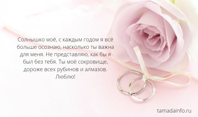 Солнышко моё, с каждым годом я всё больше осознаю, насколько ты важна для меня. Не представляю, как бы я был без тебя. Ты моё сокровище, дороже всех рубинов и алмазов. Люблю!