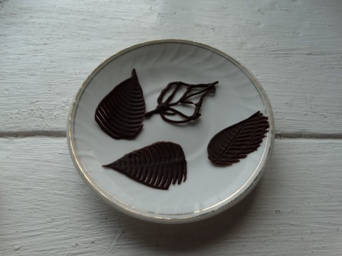 - Шоколадные листья – оригинальное украшение для любого кондитерского изделия. Они реалистичны, съедобны и удивительно похожи на настоящие. Приготовить их просто: возьмите понравившиеся листья с дерева или комнатного растения, промойте, высушите. На внутреннюю сторону нанесите растопленный шоколад – белый, горький или молочный. Положите в холод, а когда глазурь застынет, аккуратно снимите настоящие листочки. Наносите глазурь широкой кистью из силикона.