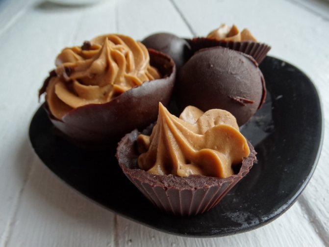 Высота чашечек, которые мы делаем при помощи шариков, на ваш вкус. Можно лишь слегка окунуть шарики в шоколад, а можно наклонить шарик и смазать его шоколадом очень высоко со всех сторон.