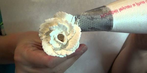 Если нужно сделать из крема розу, сначала вырезают из бисквита небольшую лепешку (или берут цукат, профитроль и т. п.) – сердцевину розы. Сердцевину укрепляют на палочке с заостренным концом и насаженной на нее пробкой или на столовой вилке. В левой руке держат палочку с сердцевиной, в правой – кондитерский мешок с трубочкой. Поворачивая палочку, на сердцевину выдавливают крем. Когда роза будет готова, ее лопаточкой или вилкой снимают с палочки, придерживая пальцами левой руки, и укладывают на торт или пирожное.