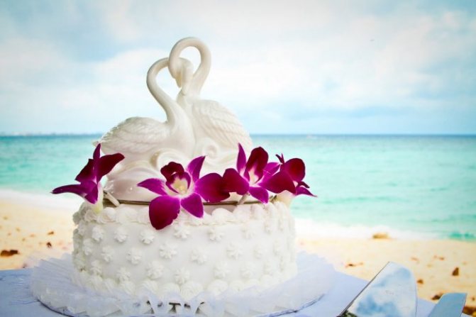 Если вы хотите, чтобы лебеди стали символом вашей семейной жизни, то можете приобрести в магазине фигуры из фарфора. Они будут достойно смотреться на коржах. Поместите их сверху, а после банкета заберите домой.