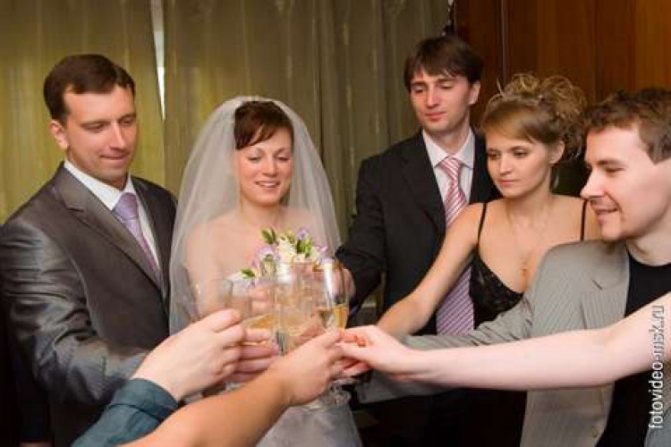 : первой всё выпила подружка невесты — у молодожёнов родится дочь; с задачей быстрее справился шафер — придётся выбирать имя для сына.
