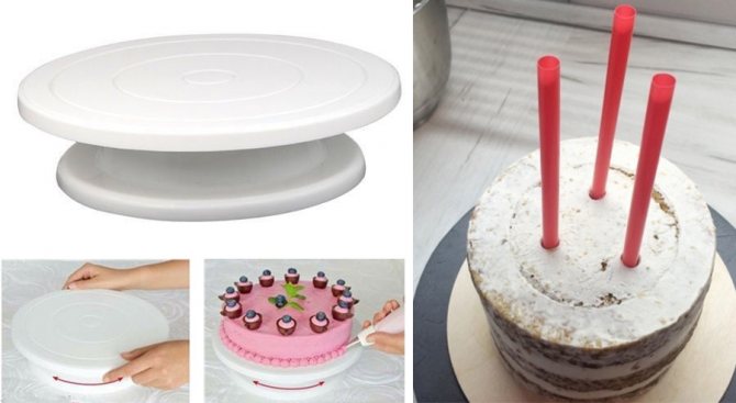 - Обычная подставка требуемого размера, на которой располагается нижний ярус десерта. Все последующие слои опираются на нижний.