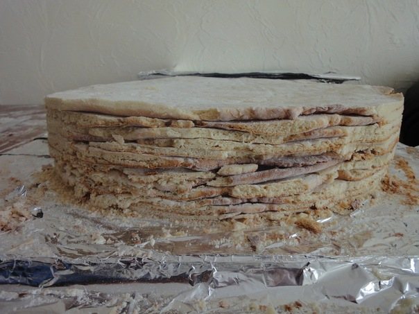 Остальные слои пекла в формах, так что проблем не было, только учтите, для высоты в 12 см придется выпечь полных 2 формы и порезать на 4 коржа.